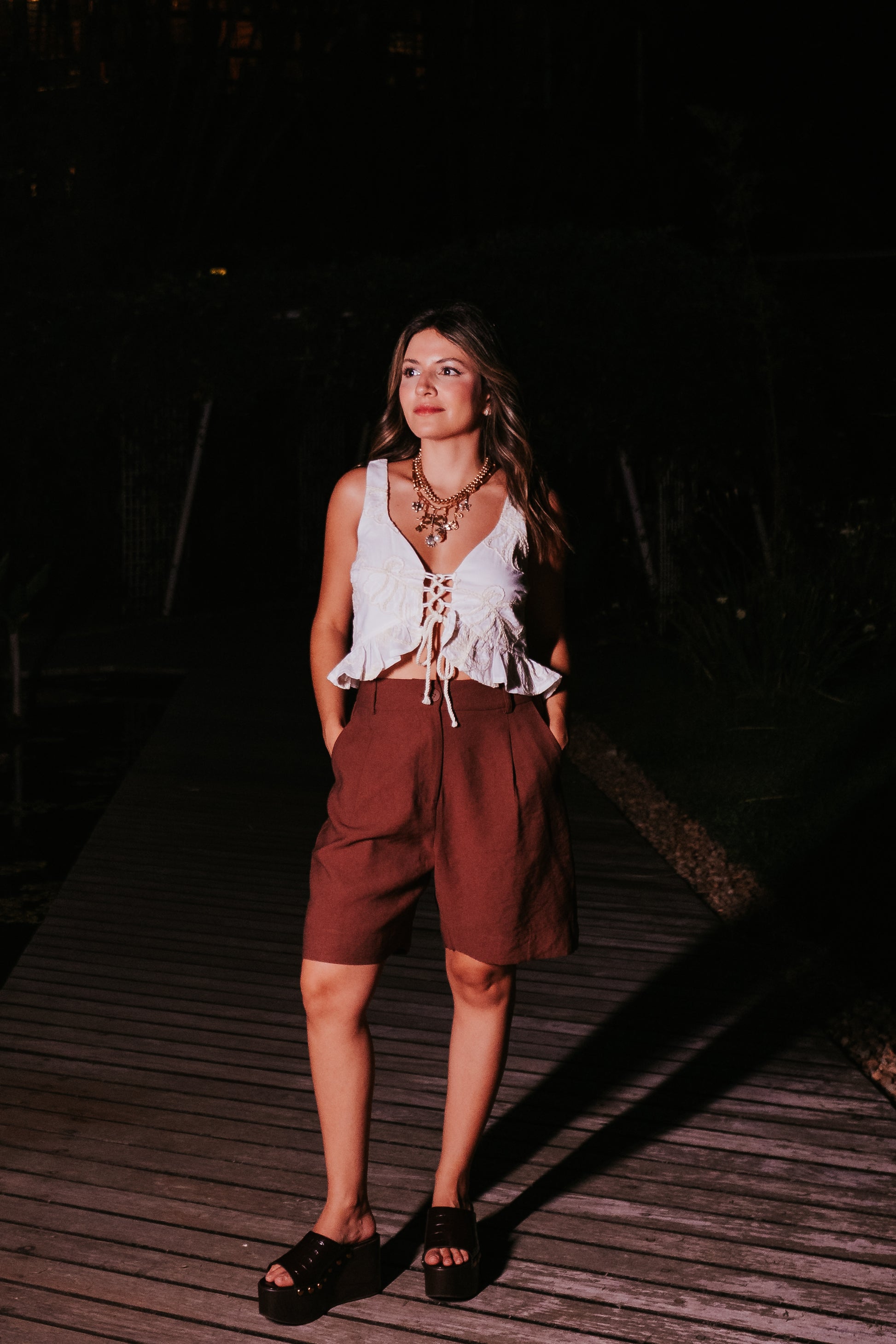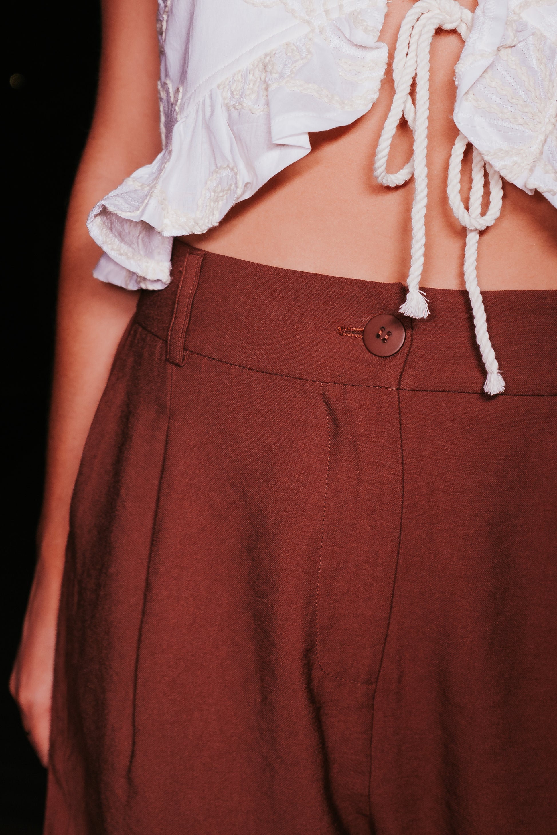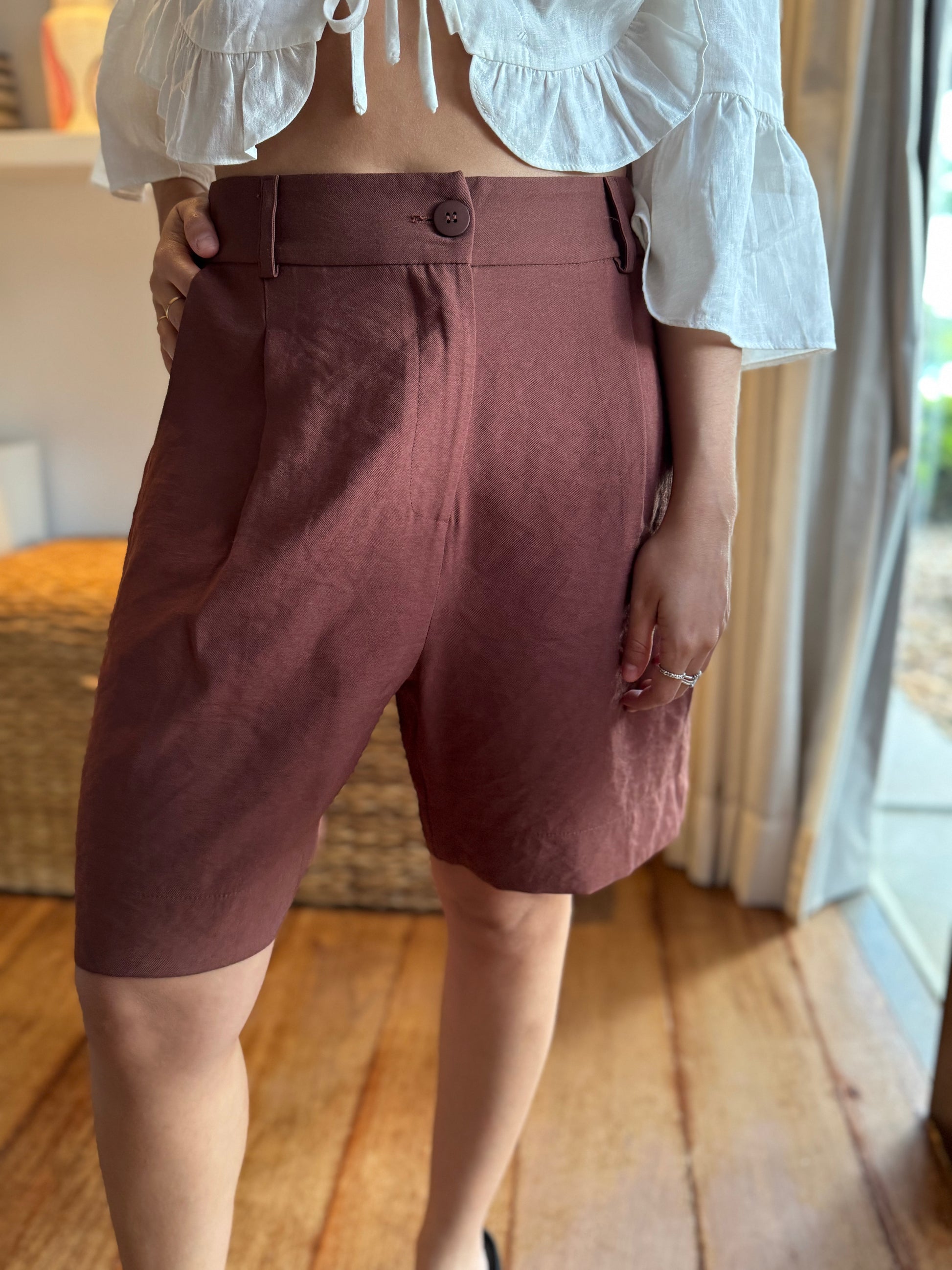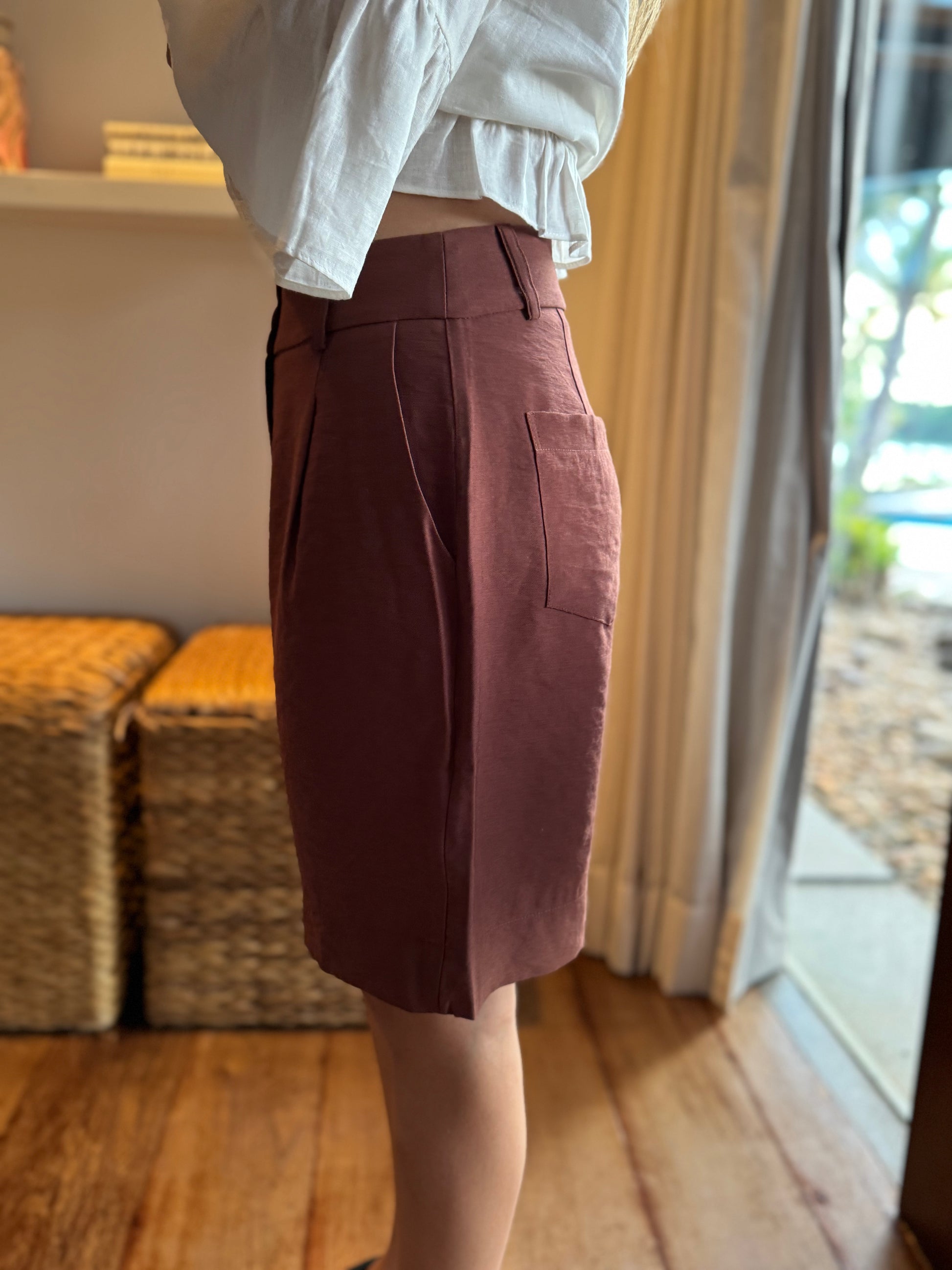 Bermuda marrom em alfaiataria, 100% viscose. Possui bolsos laterais e traseiros.