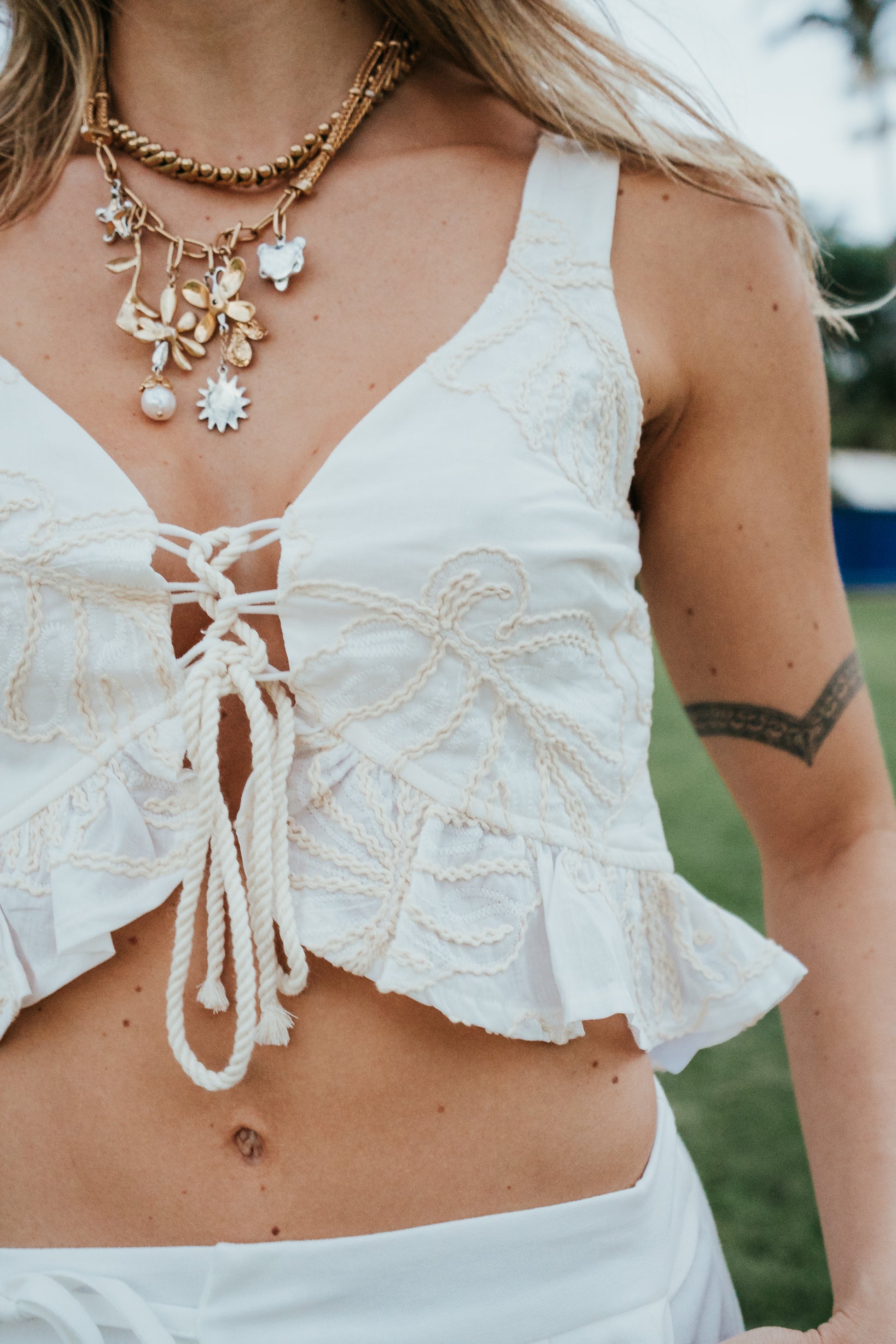Cropped 100% algodão com alças largas, amarração em cordão frontal e com detalhes bordados em alto relevo.