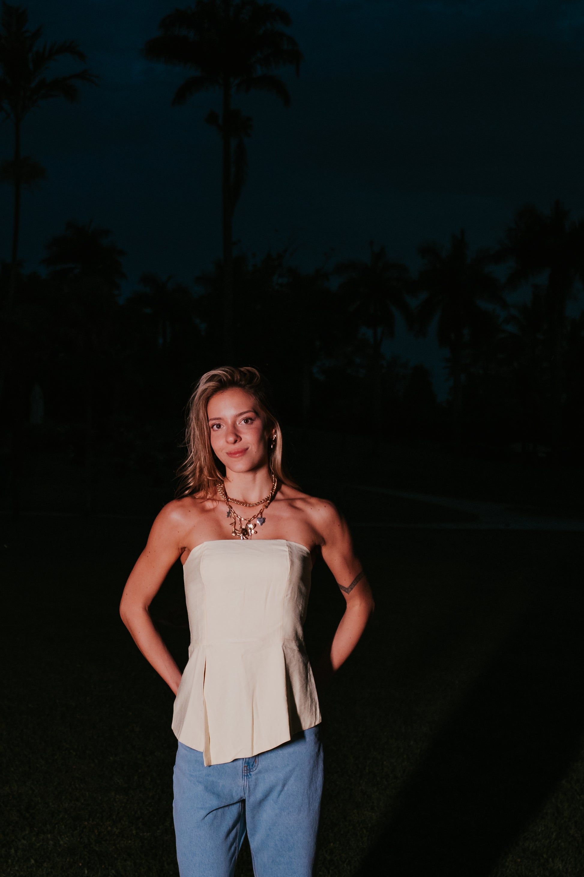 Blusa tomara que caia confeccionada em marrant macio. Possui zíper e lastex nas costas. Recorte assimétrico na parte frontal da blusa.