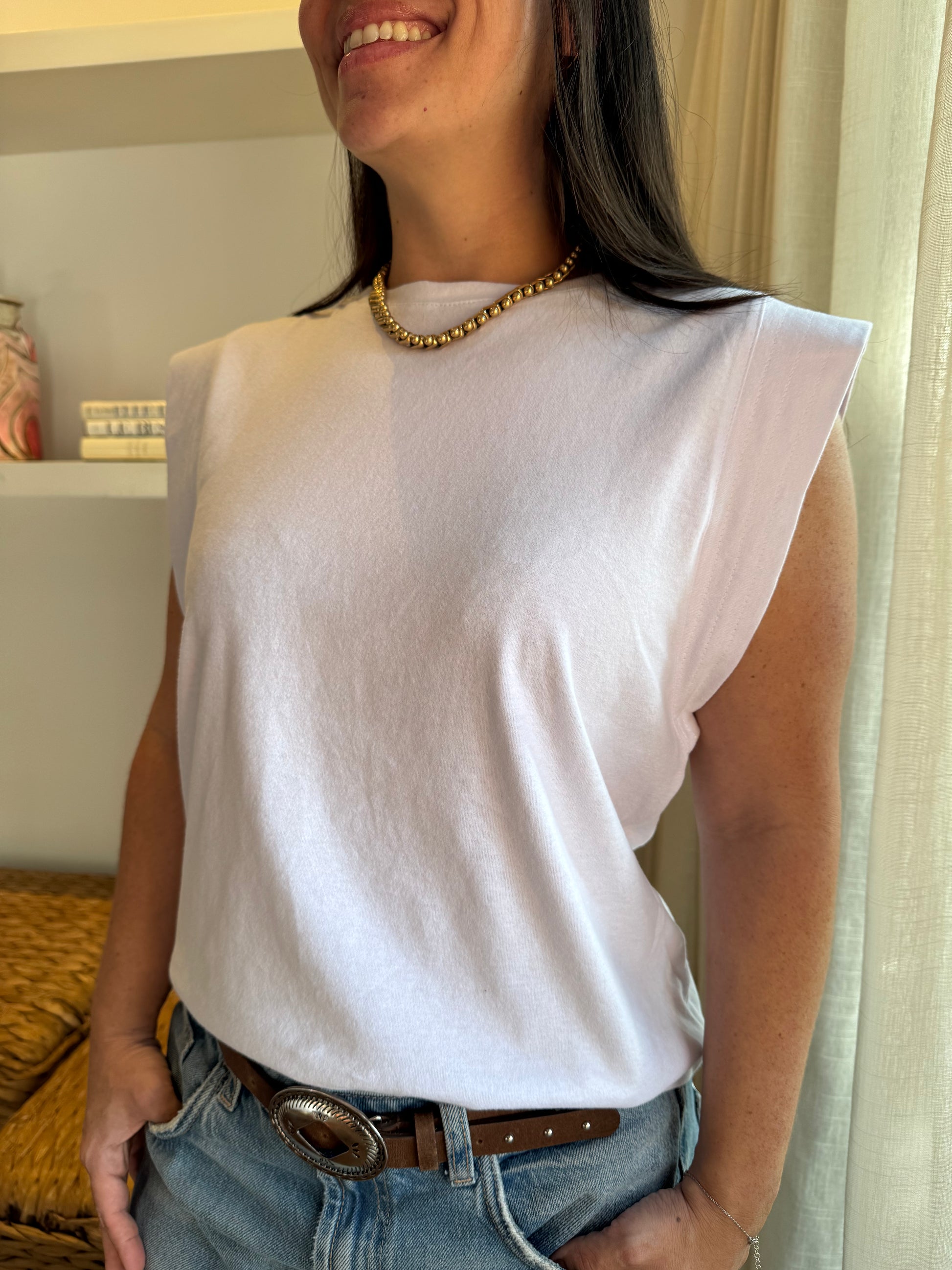 Blusa branca regata, estilo muscle tee (ombros levemente estruturados). Gola arredondada. Confeccionada em 100% algodão.