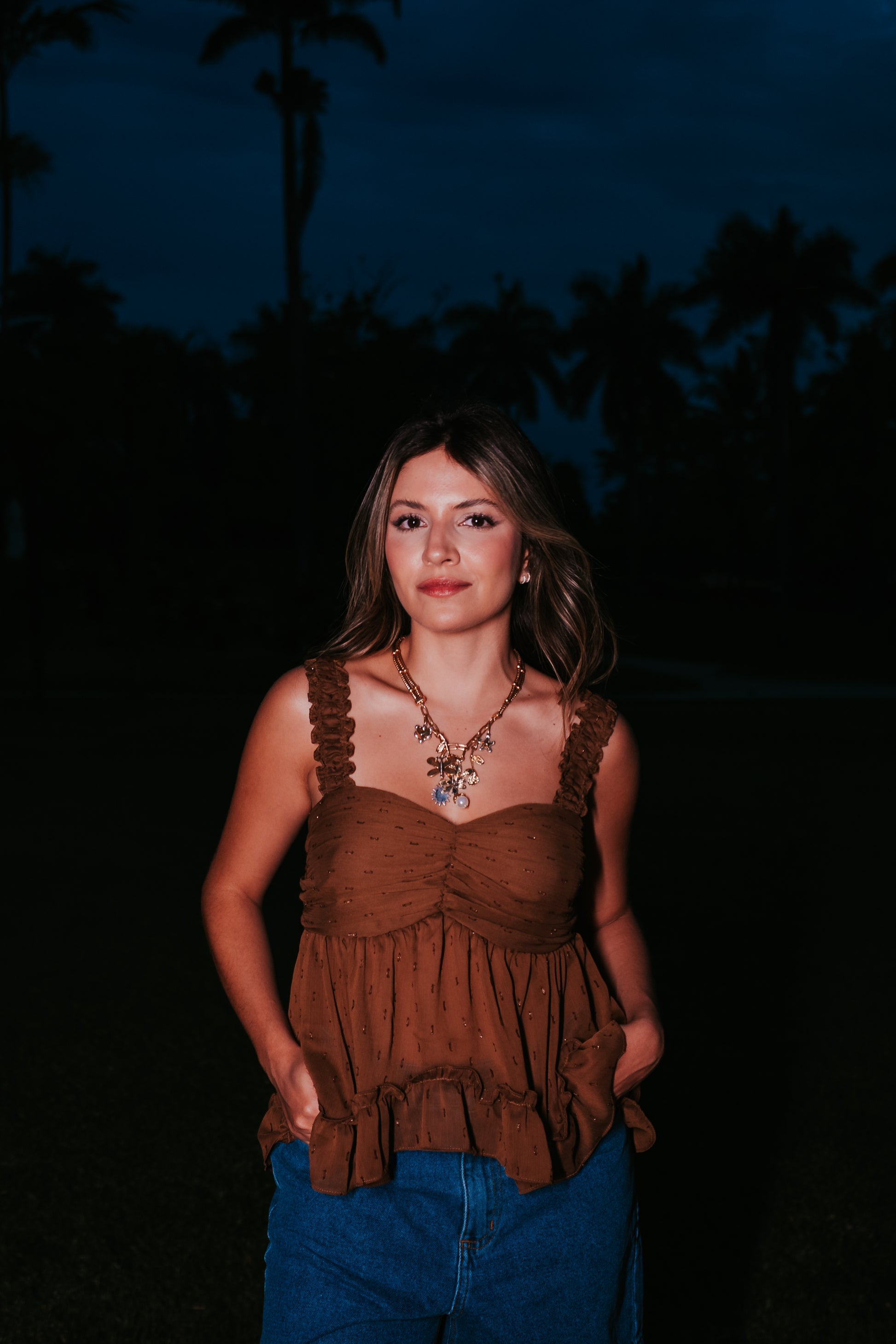 Blusa marrom terroso com busto drapeado. Alças largas com babados. Tecido delicado possui detalhes discretos com aplicações brilhantes.