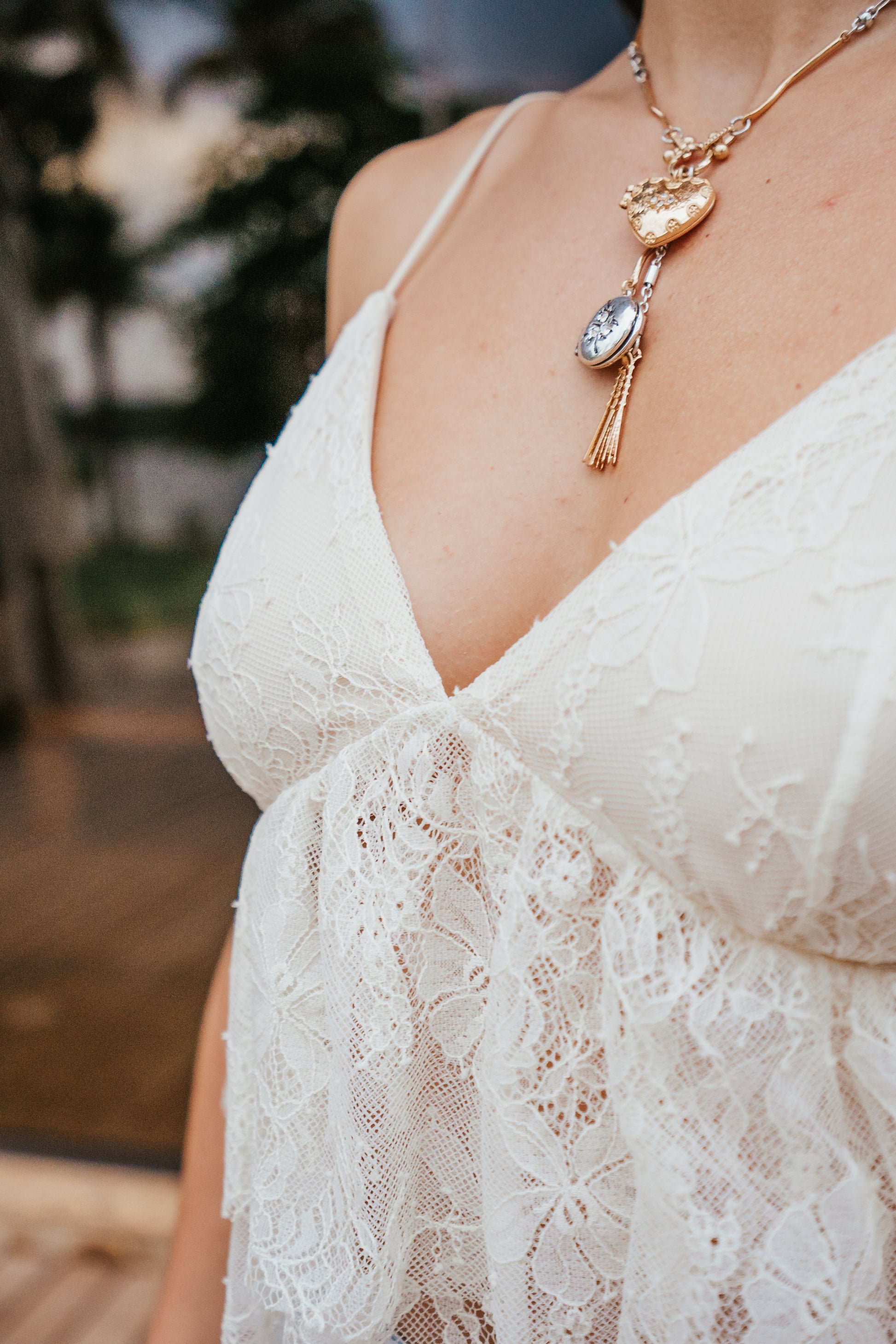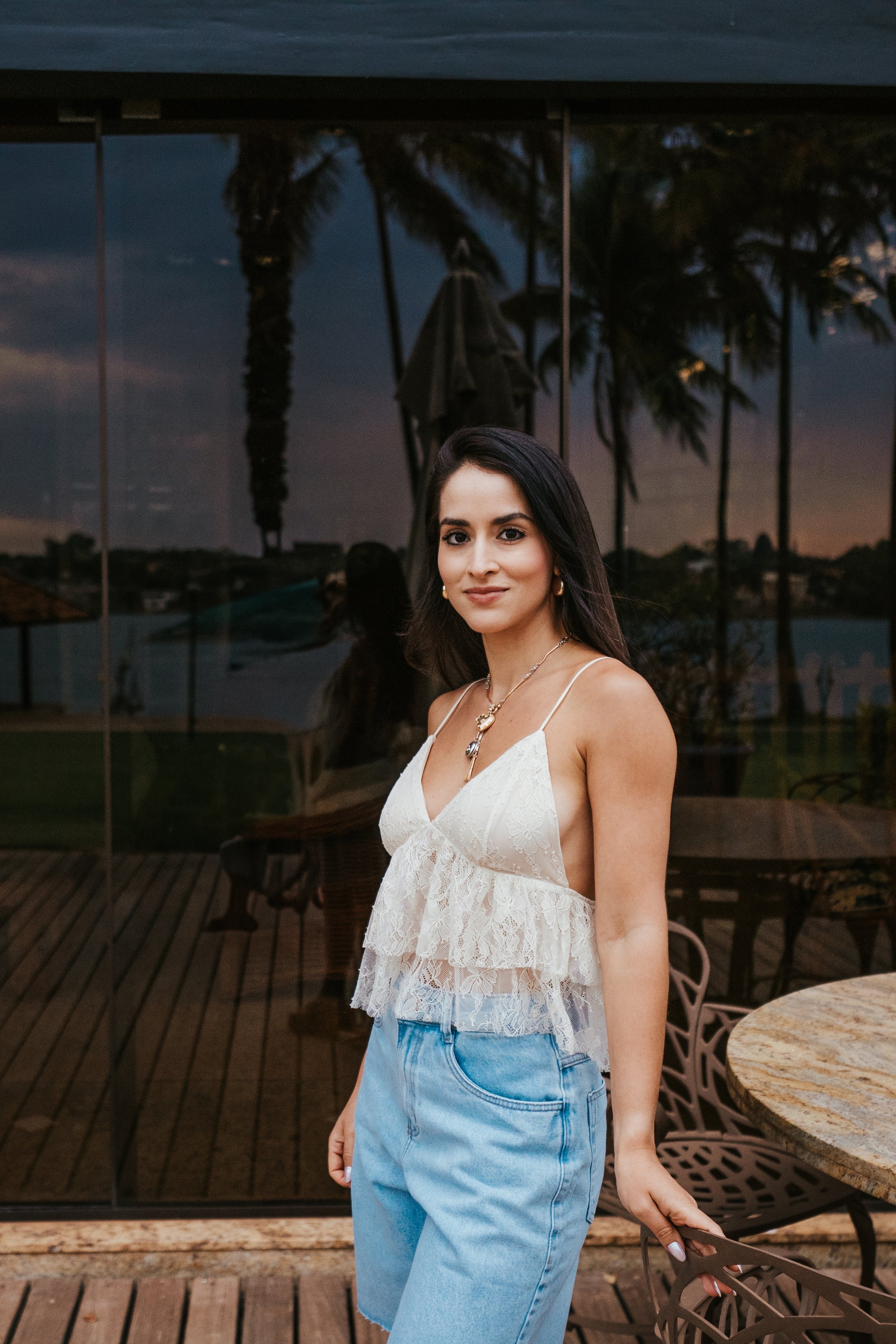 Blusa de renda com alças finas e babados. É forrada e possui elástico nas costas, garantindo melhor ajuste ao corpo.