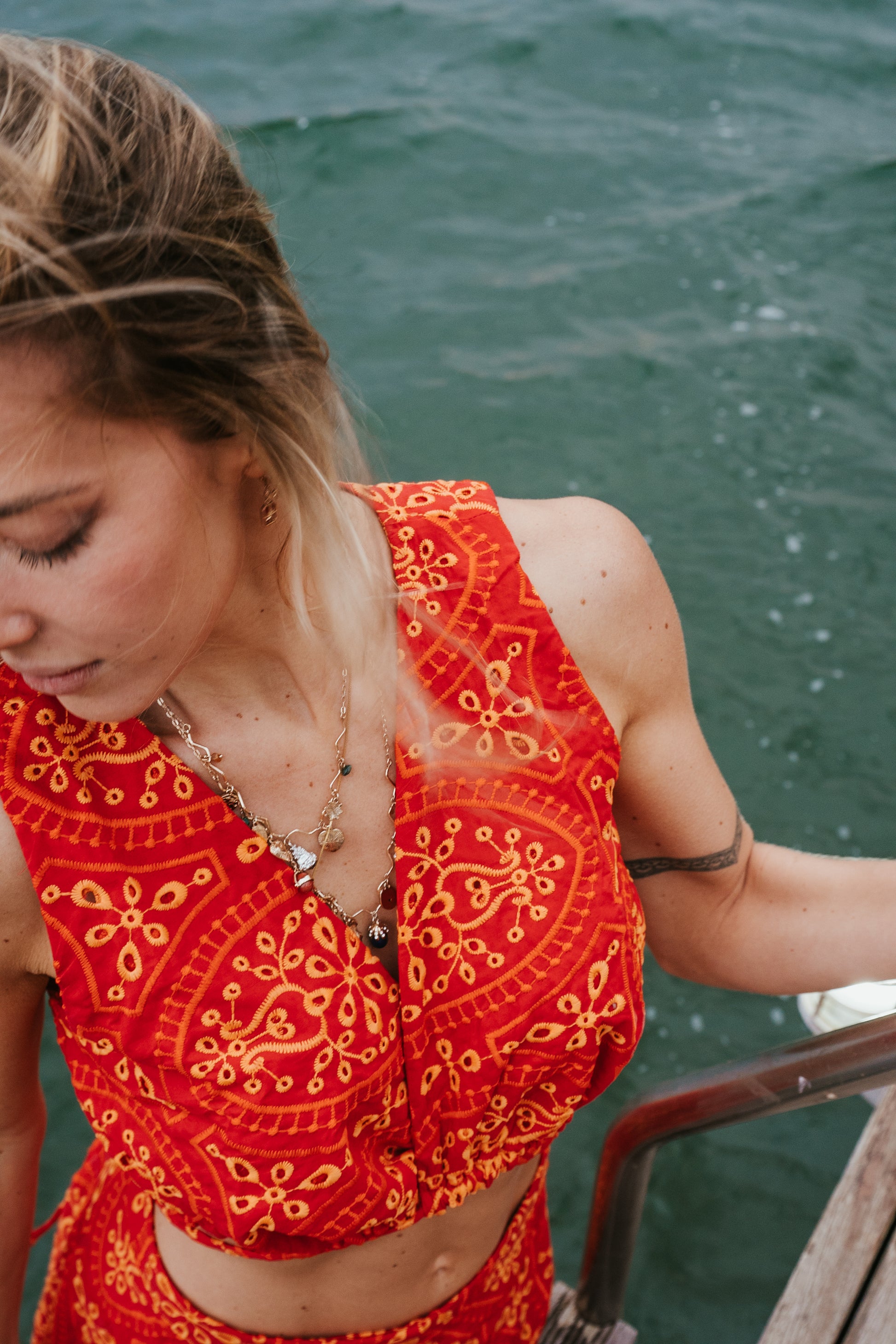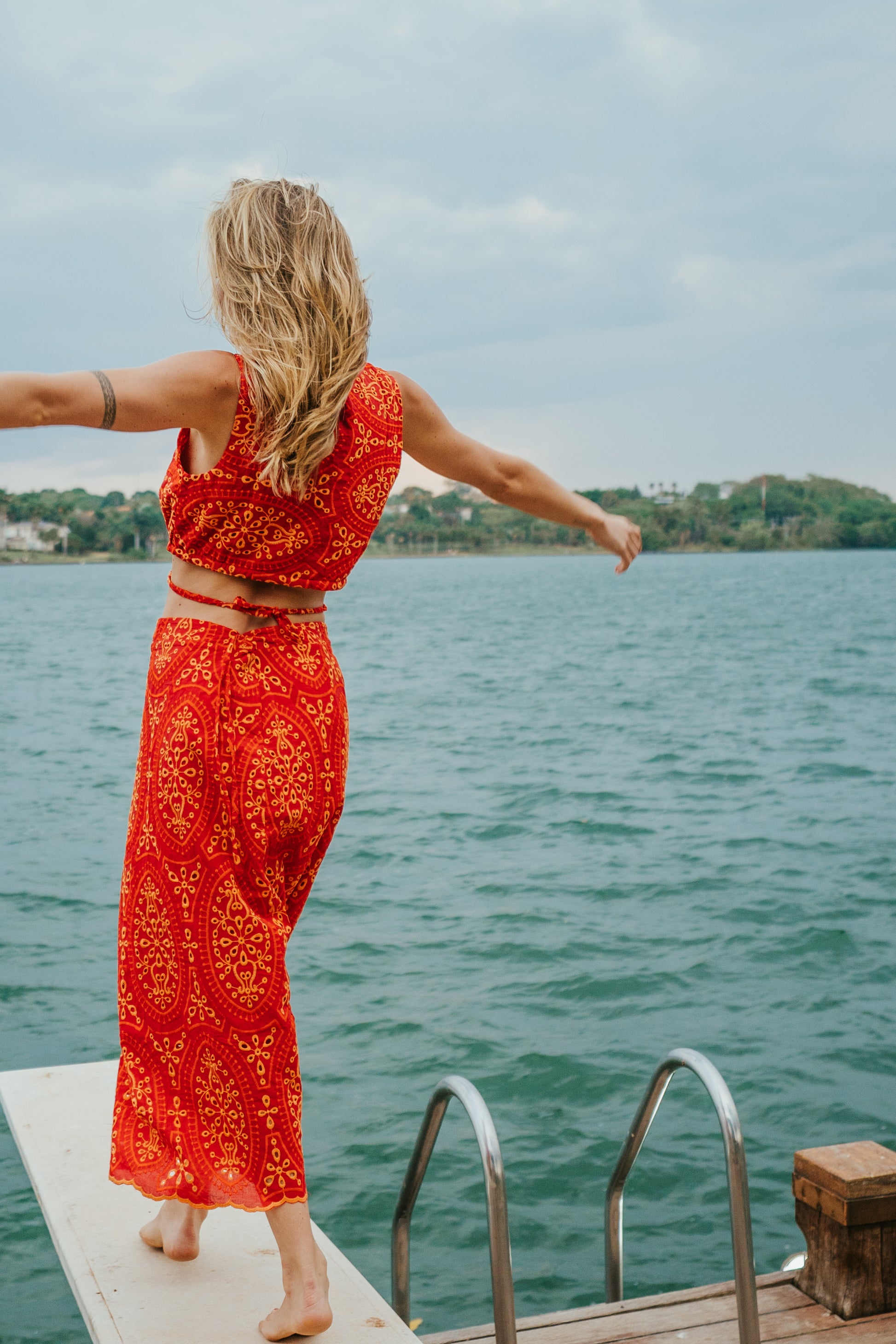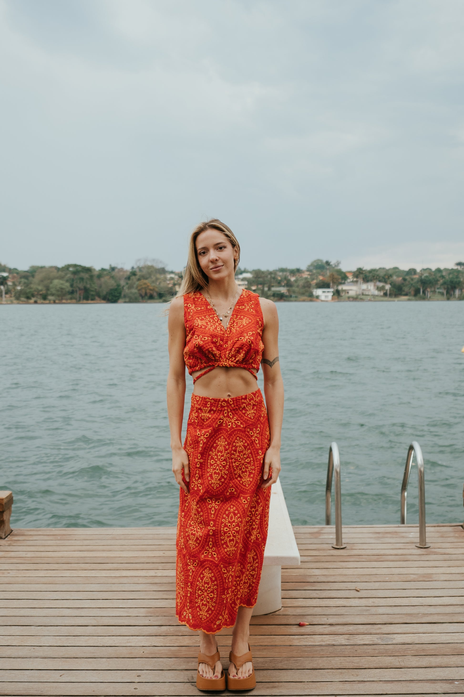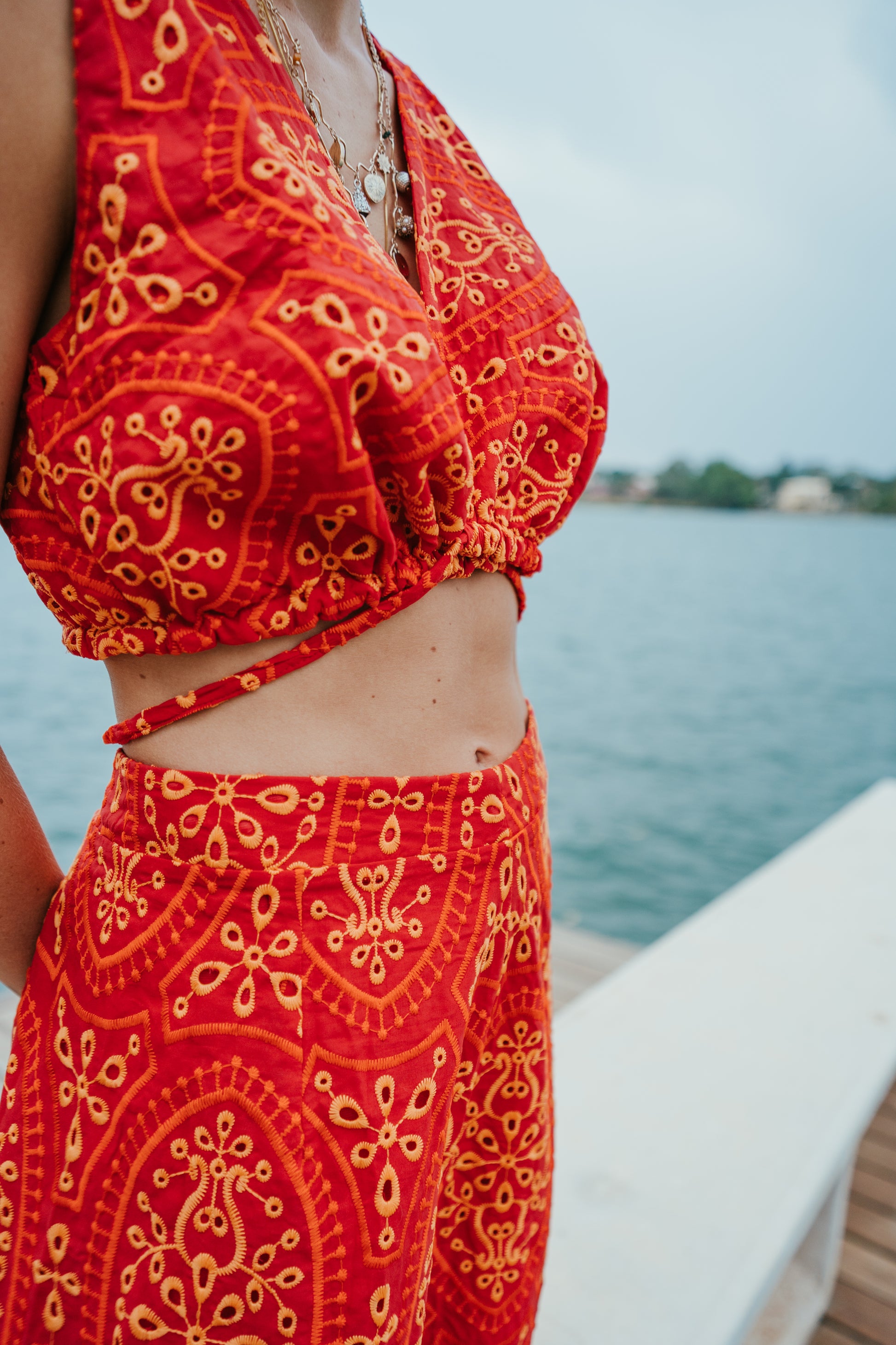 Conjunto em laise bicolor, que combina o vermelho intenso com detalhes delicados, criando um visual marcante e sofisticado. A barra é bordada e possui forro.