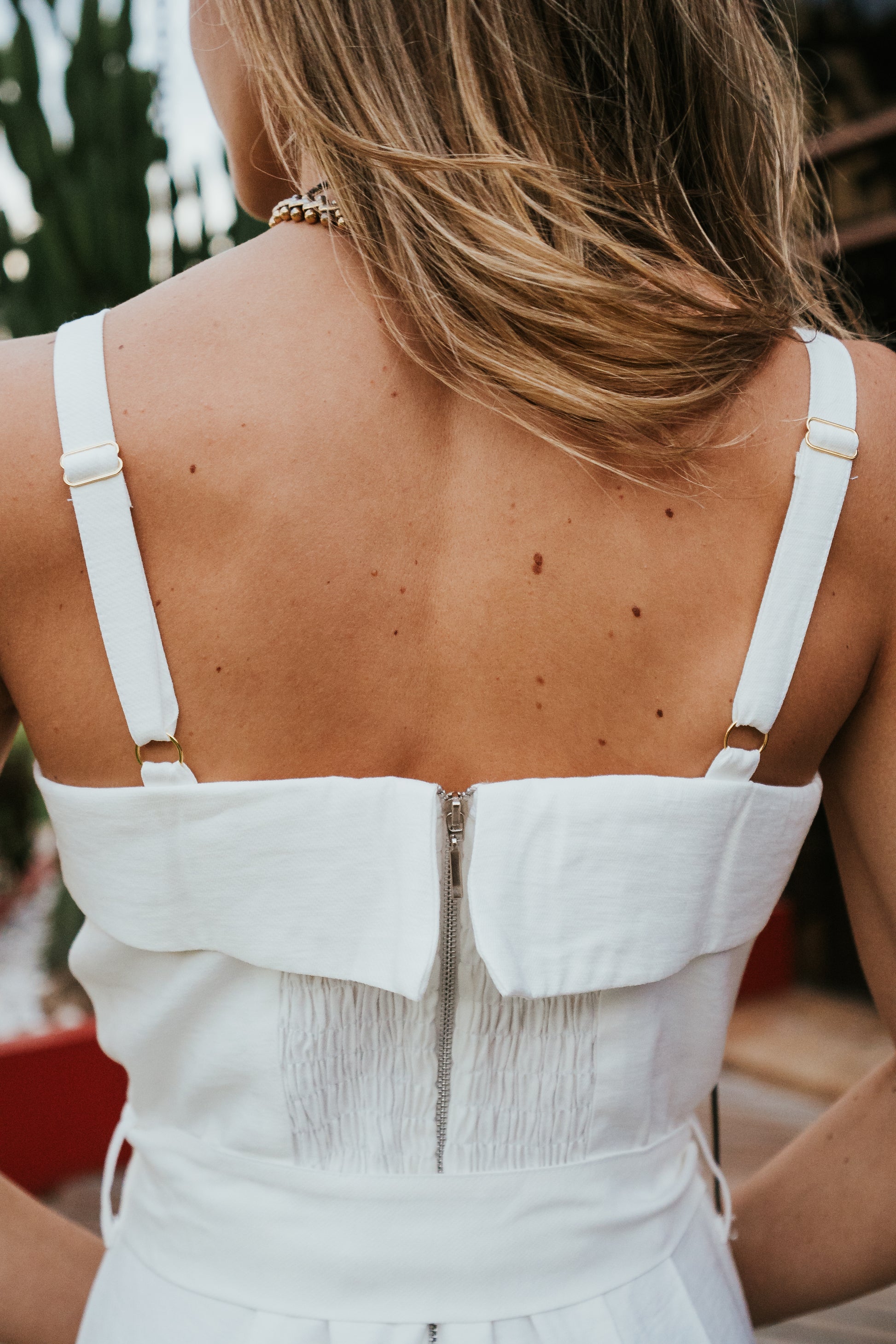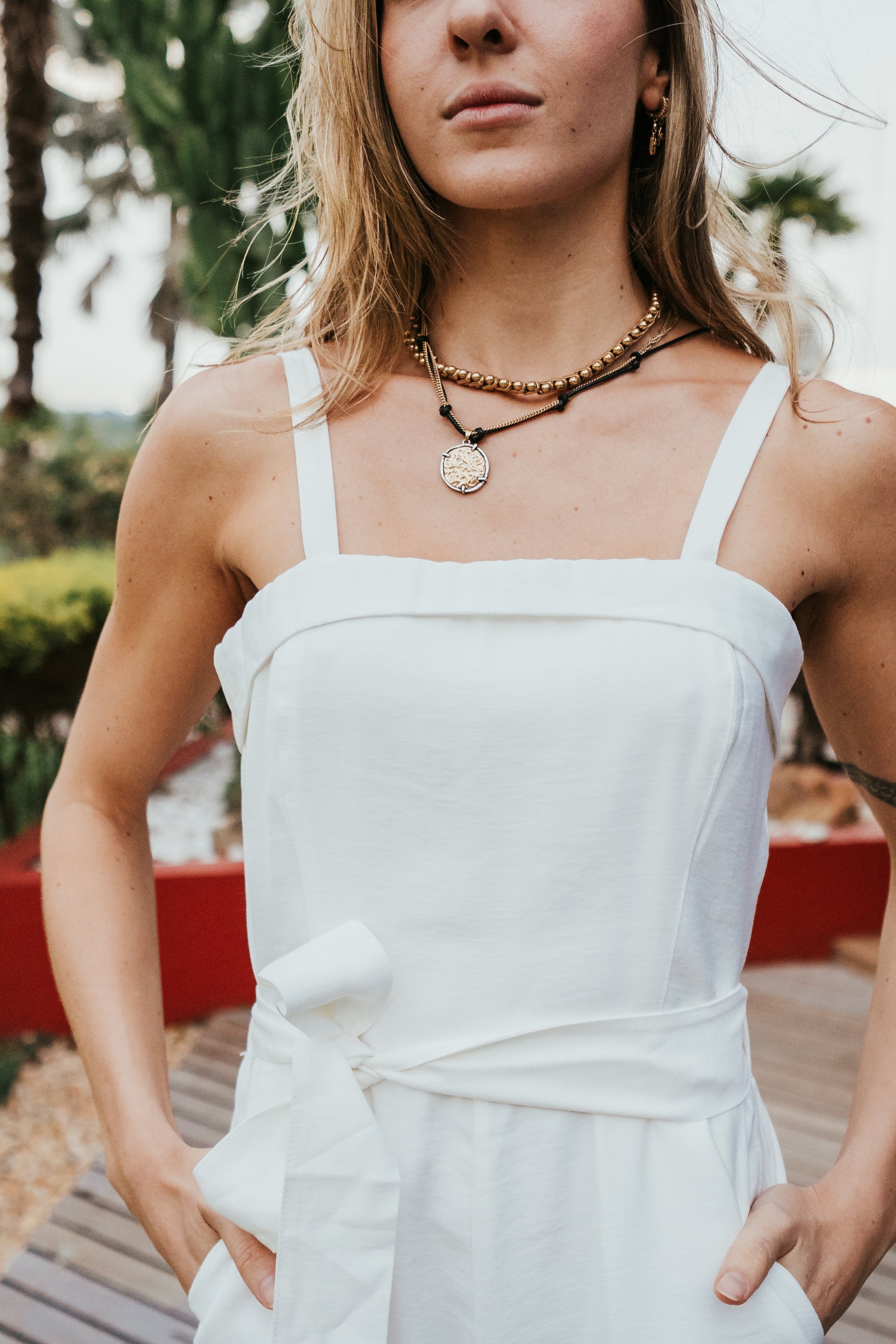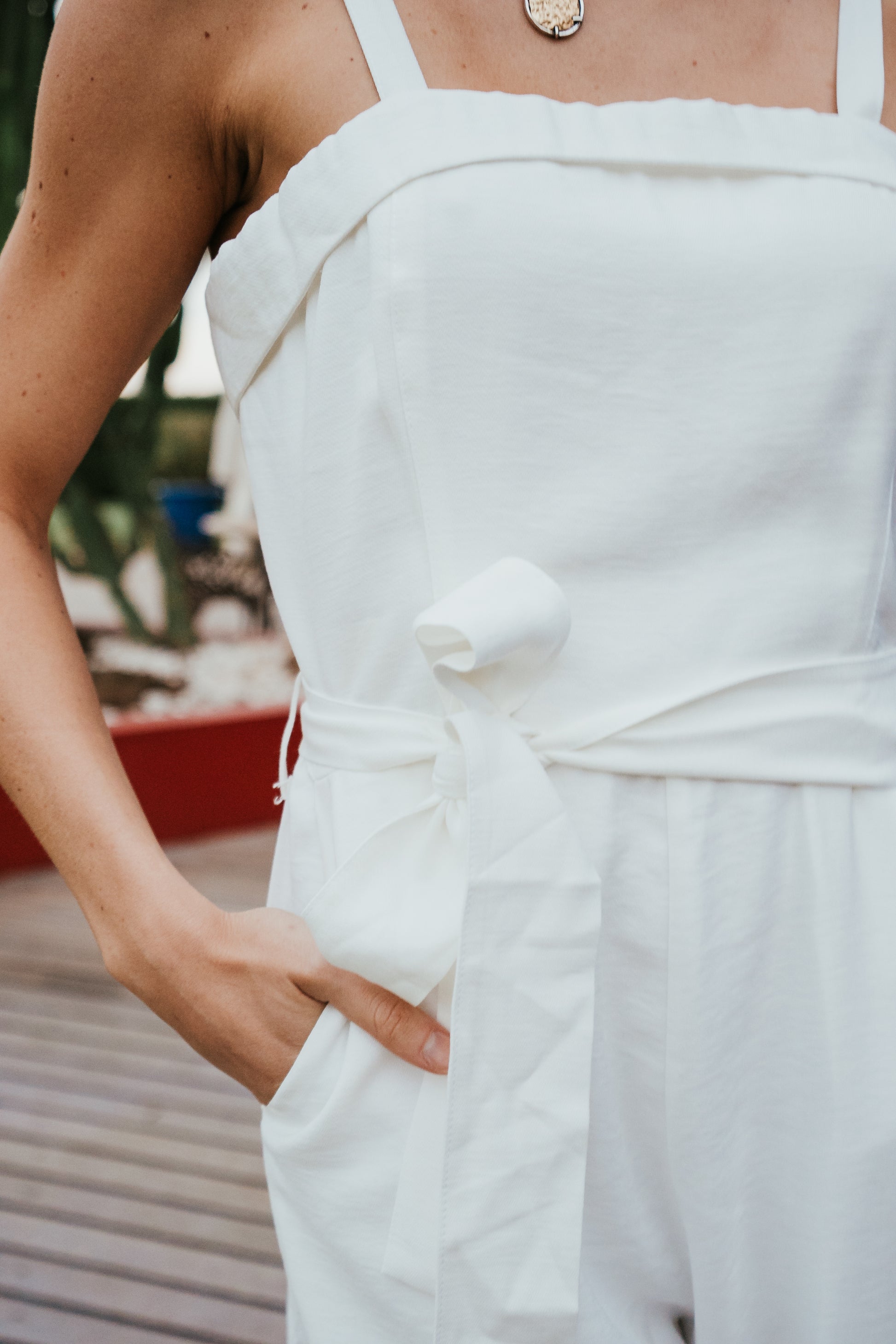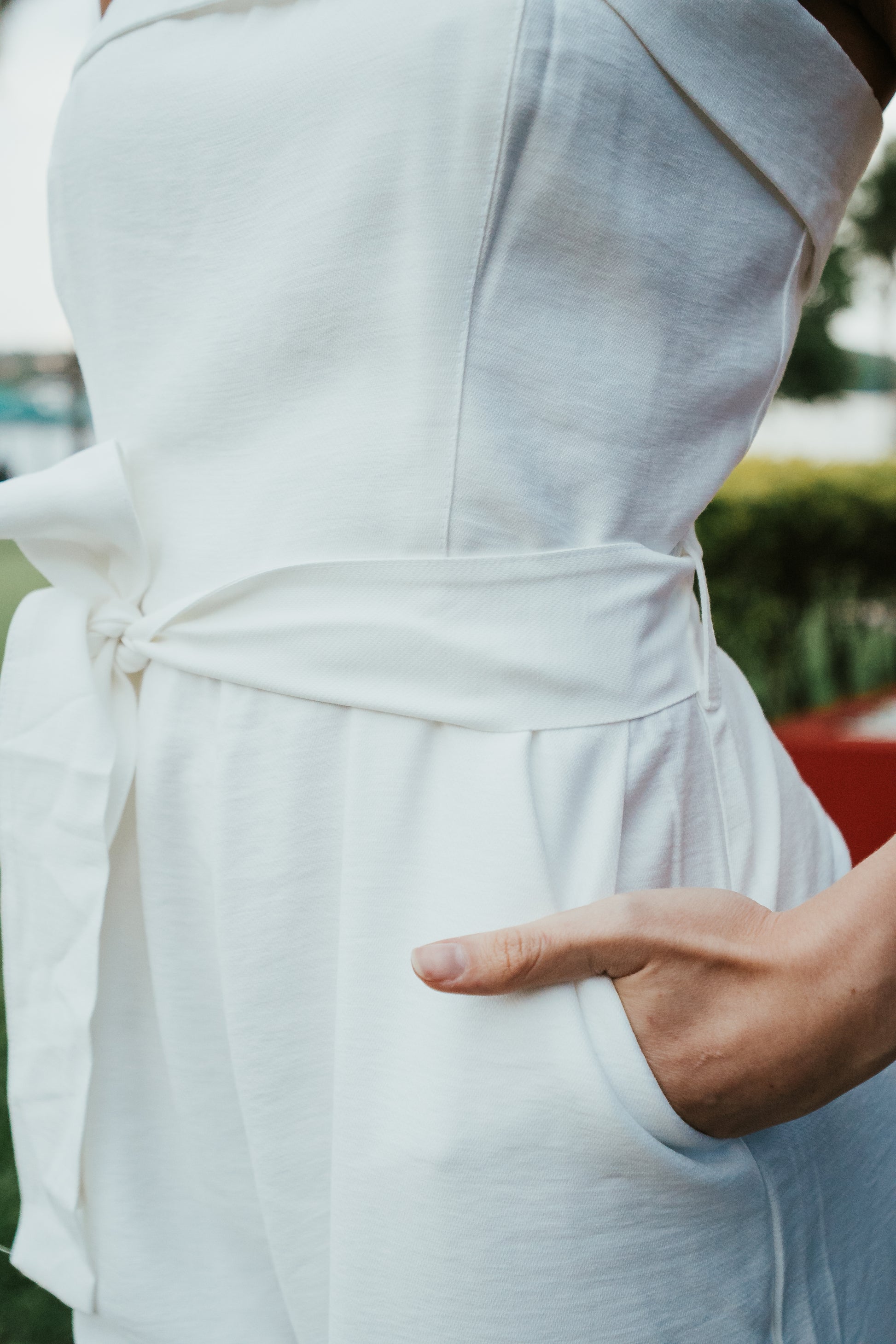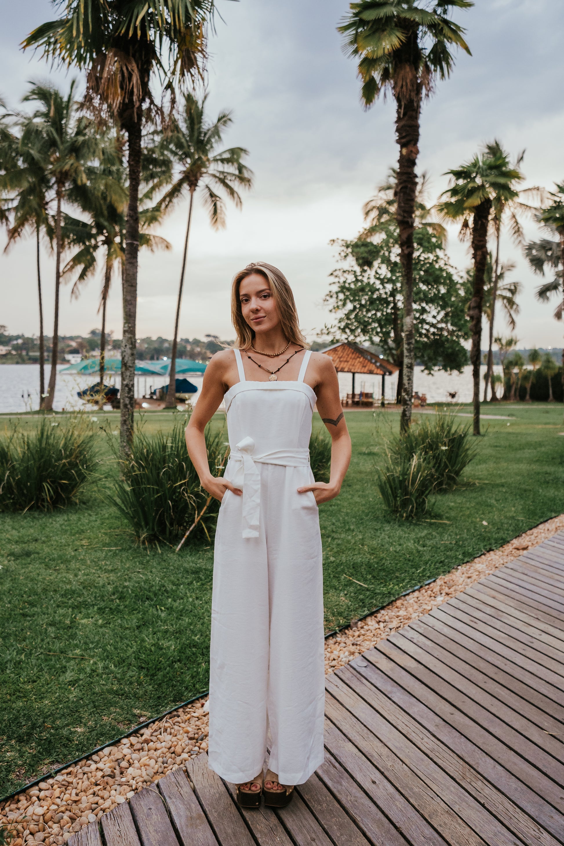 Macacão longo com faixa na cintura. Possui forro e lastex nas costas.