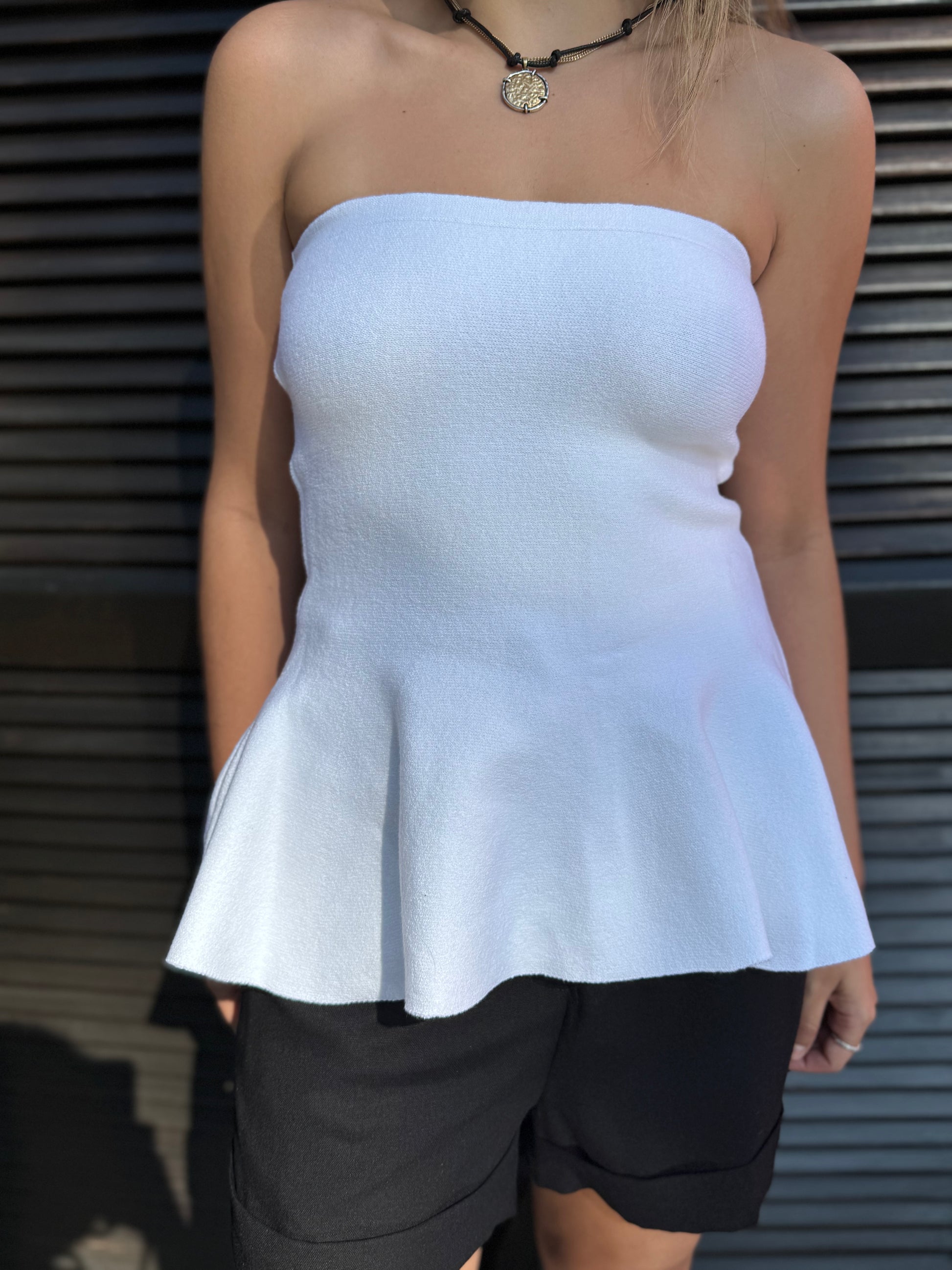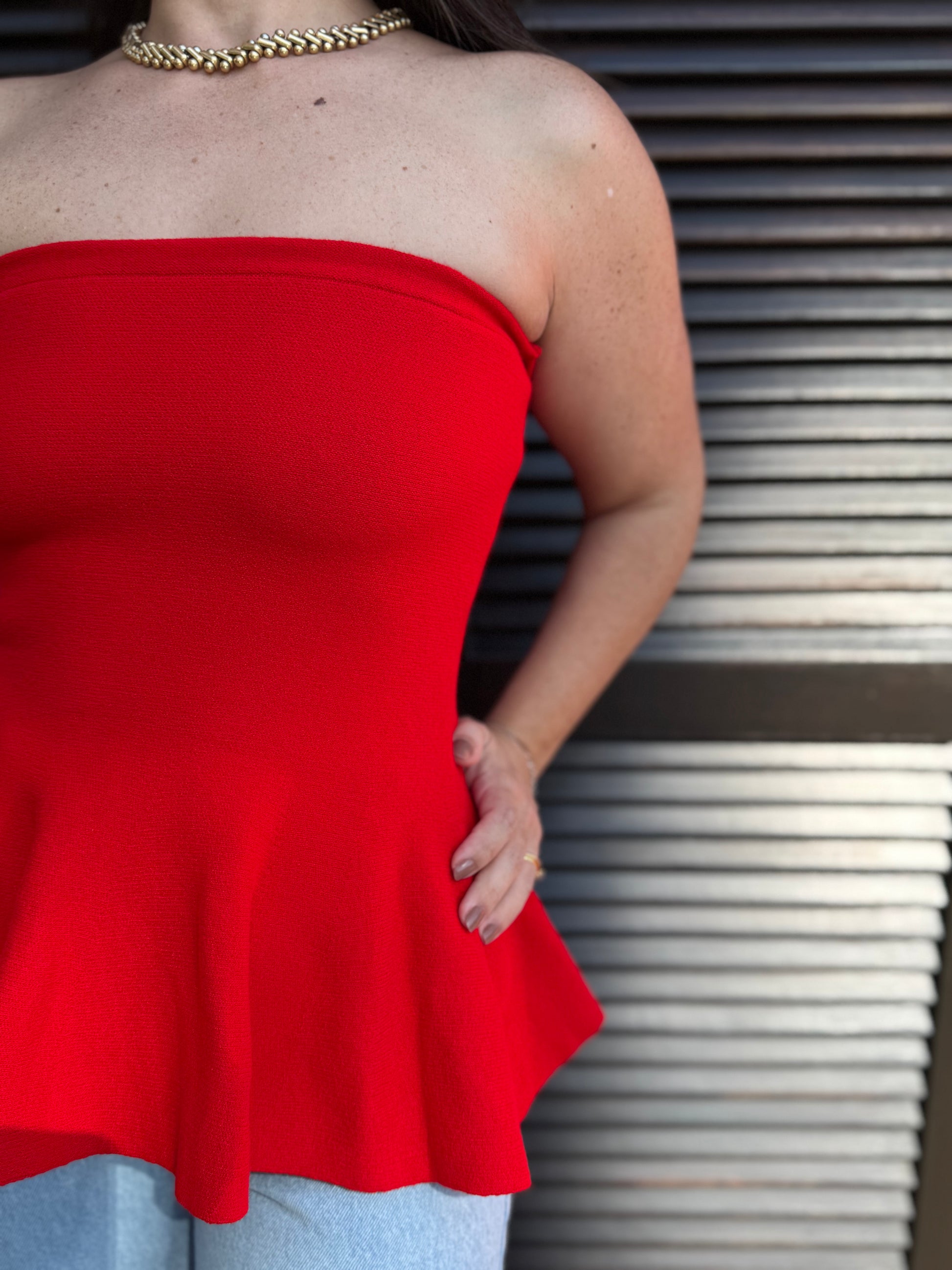 Blusa tomara que caia em peplum. Contém elasticidade que se ajusta bem ao corpo. Não possui bojo. Tamanho único: Veste do 38 ao 42.